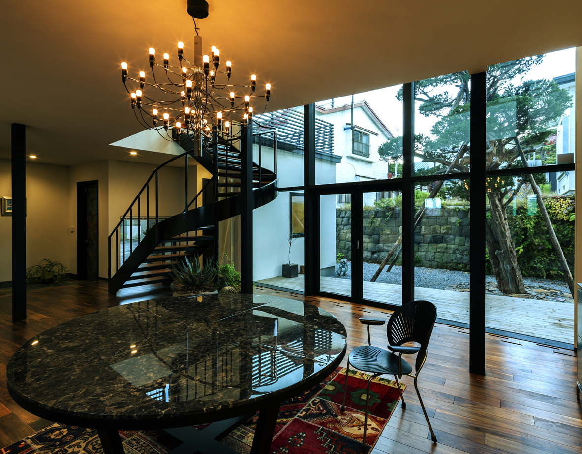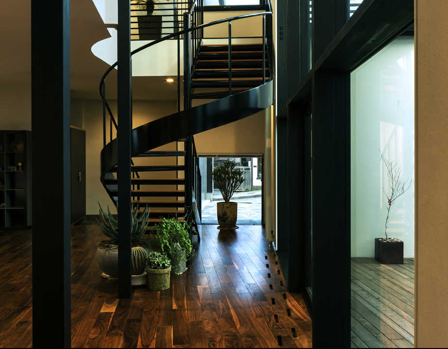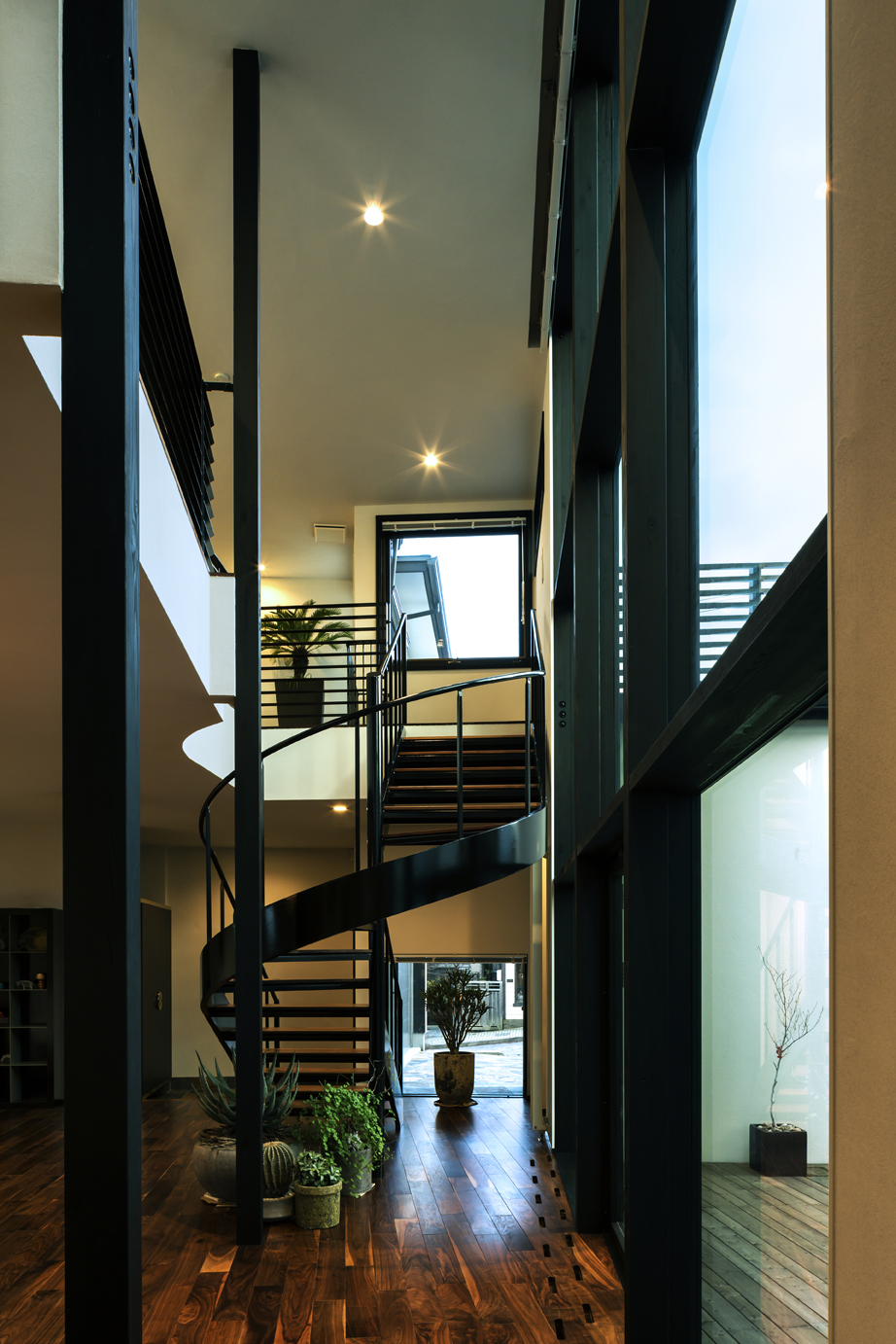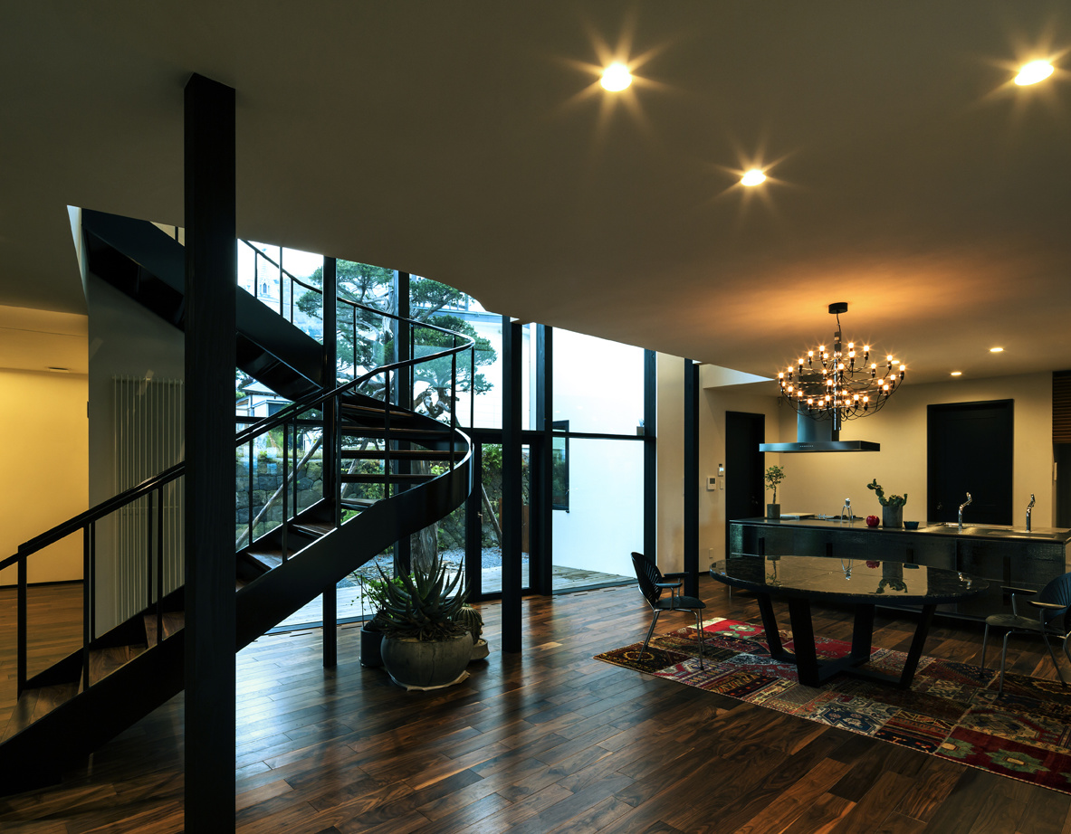 敷地の形状は少し平行四辺形になっていて、母屋は敷地の長手方向に平行に配置するが、前面道路側はガレージを道路と平行配置することで、建物に角度が生まれ、外部の玄関ポーチや内部の吹抜け等にここにしか存在しない敷地形状のエッセンスが入り込む。その吹抜け空間に大きな開口部と中庭を設けてタテ動線に鉄骨の螺旋階段を配置し、それらを中心に諸室へつながる構成となっている。1階LDKの大きな空間に黒く光沢のある鉄骨階段と二階吹抜けの手すりの存在感が、白い塗り壁に際立ってこの建物の名称の由来となる。この黒という色の選択肢が空間に重みも与え、落ち着いた緊張感を加えており、そのイメージをベースに各部のデザインも進め、子供室や主寝室等は空間ごとのテイストを加えている。