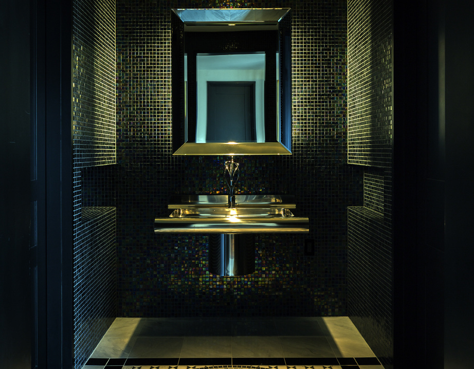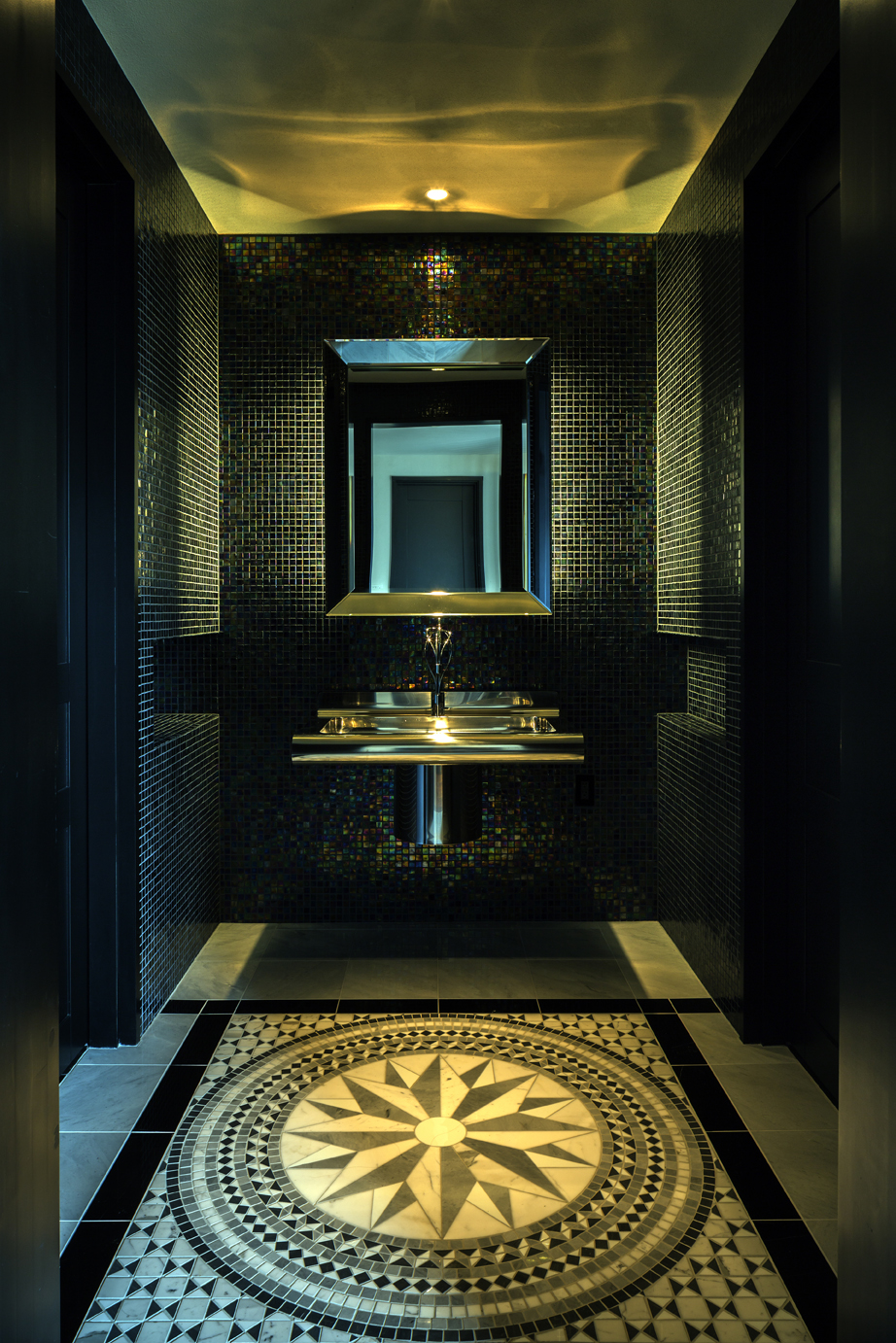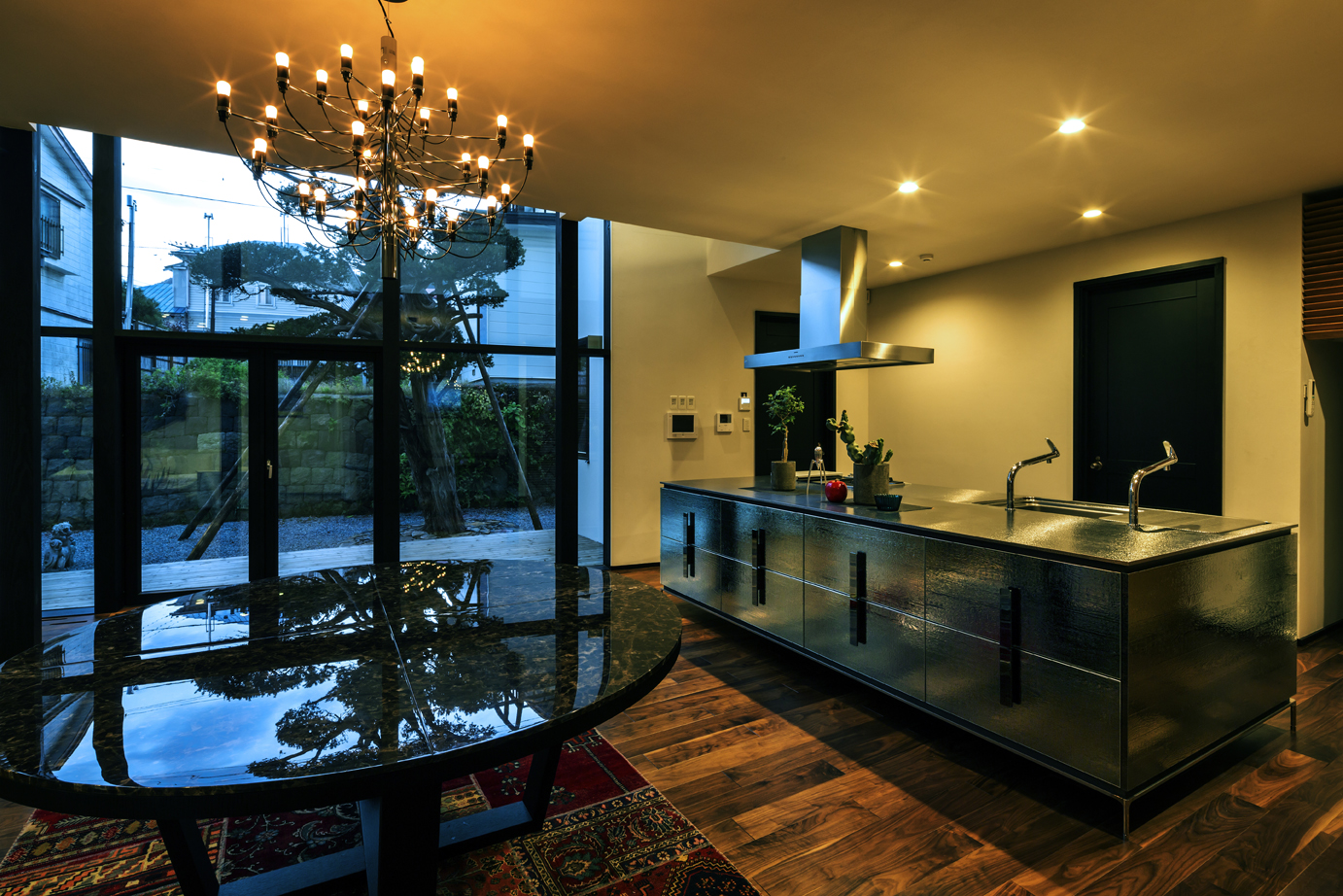 敷地の形状は少し平行四辺形になっていて、母屋は敷地の長手方向に平行に配置するが、前面道路側はガレージを道路と平行配置することで、建物に角度が生まれ、外部の玄関ポーチや内部の吹抜け等にここにしか存在しない敷地形状のエッセンスが入り込む。その吹抜け空間に大きな開口部と中庭を設けてタテ動線に鉄骨の螺旋階段を配置し、それらを中心に諸室へつながる構成となっている。1階LDKの大きな空間に黒く光沢のある鉄骨階段と二階吹抜けの手すりの存在感が、白い塗り壁に際立ってこの建物の名称の由来となる。この黒という色の選択肢が空間に重みも与え、落ち着いた緊張感を加えており、そのイメージをベースに各部のデザインも進め、子供室や主寝室等は空間ごとのテイストを加えている。
