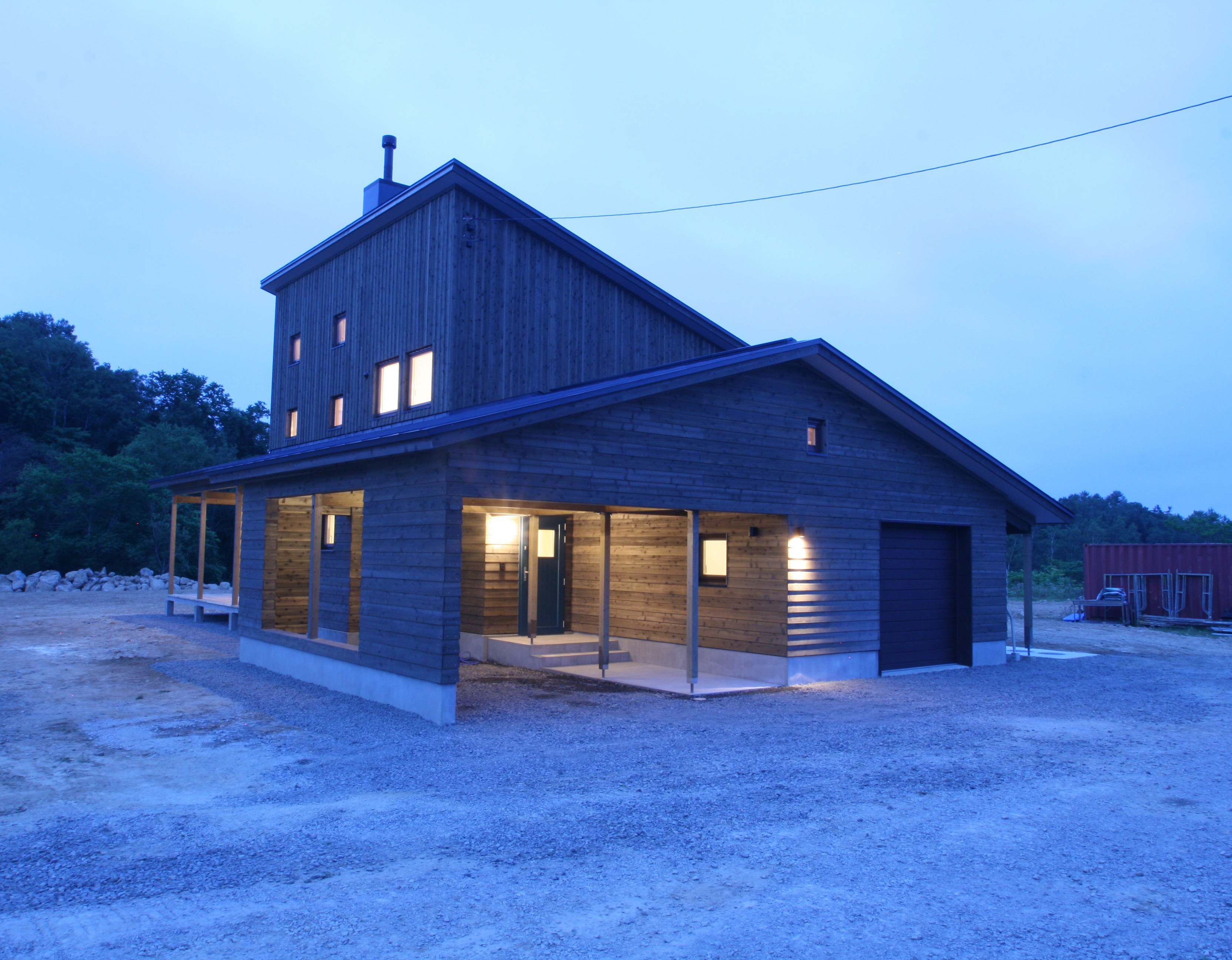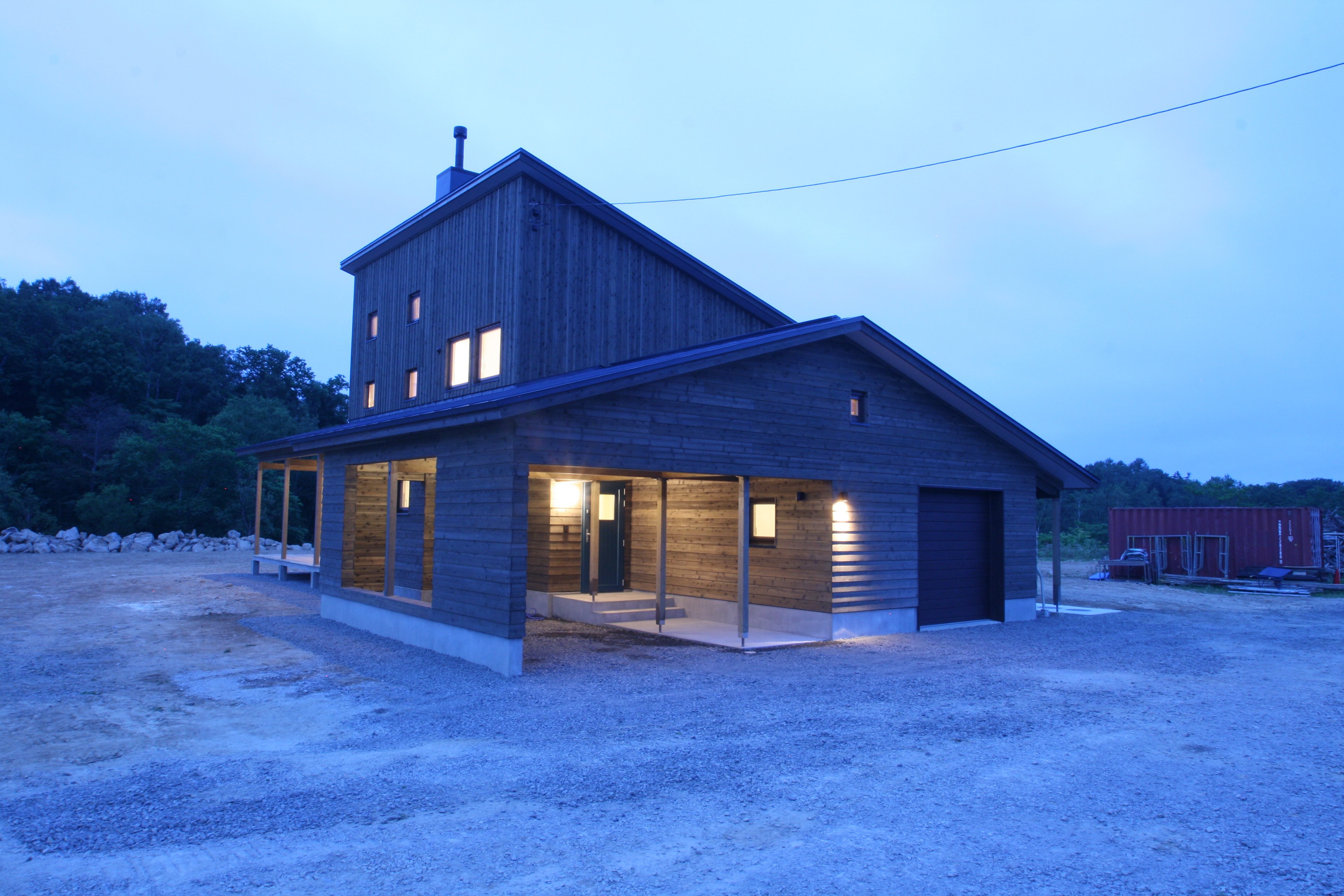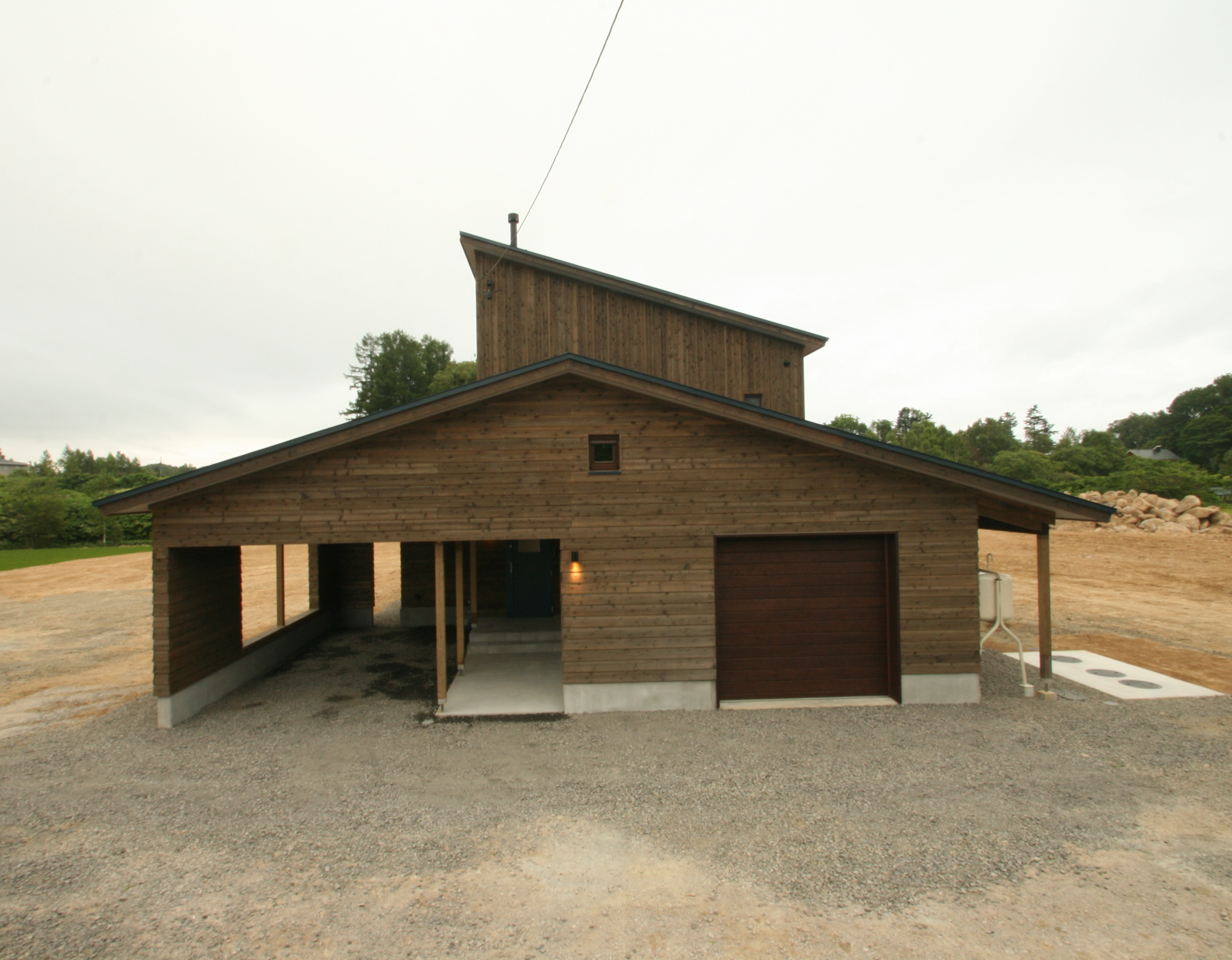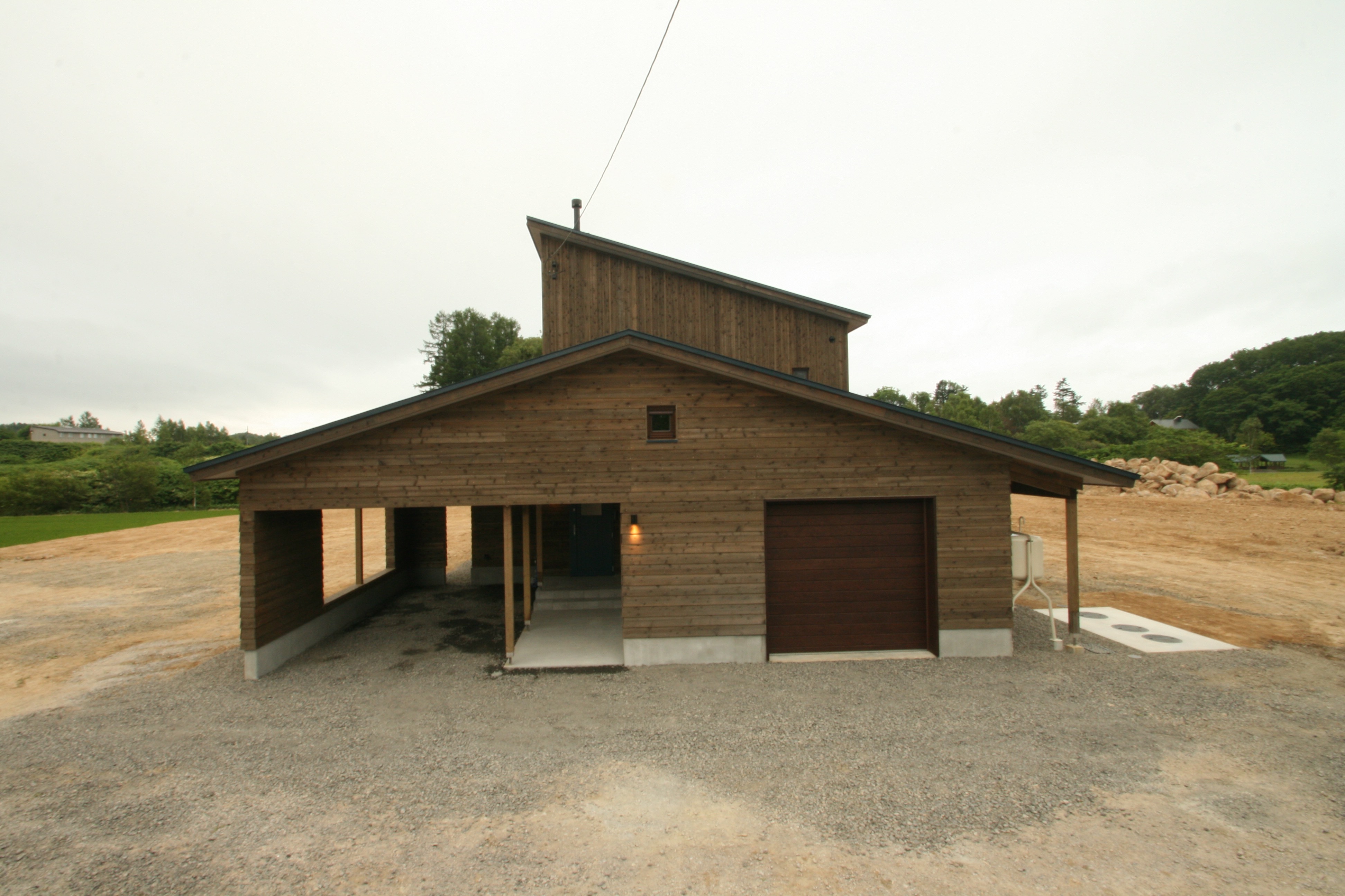 広大な土地と周囲の風景に対してどの様に対峙するかが一番最初の課題なった。羊蹄山を眺めるニセコの住宅は、二階建ての片流れ屋根(母屋)に平屋の切妻がくっついたカタチ。その母屋を囲む様に車庫、カーポート兼アプローチ、ウッドデッキが取り付いていて、多雪地域ゆえの構成になっている。