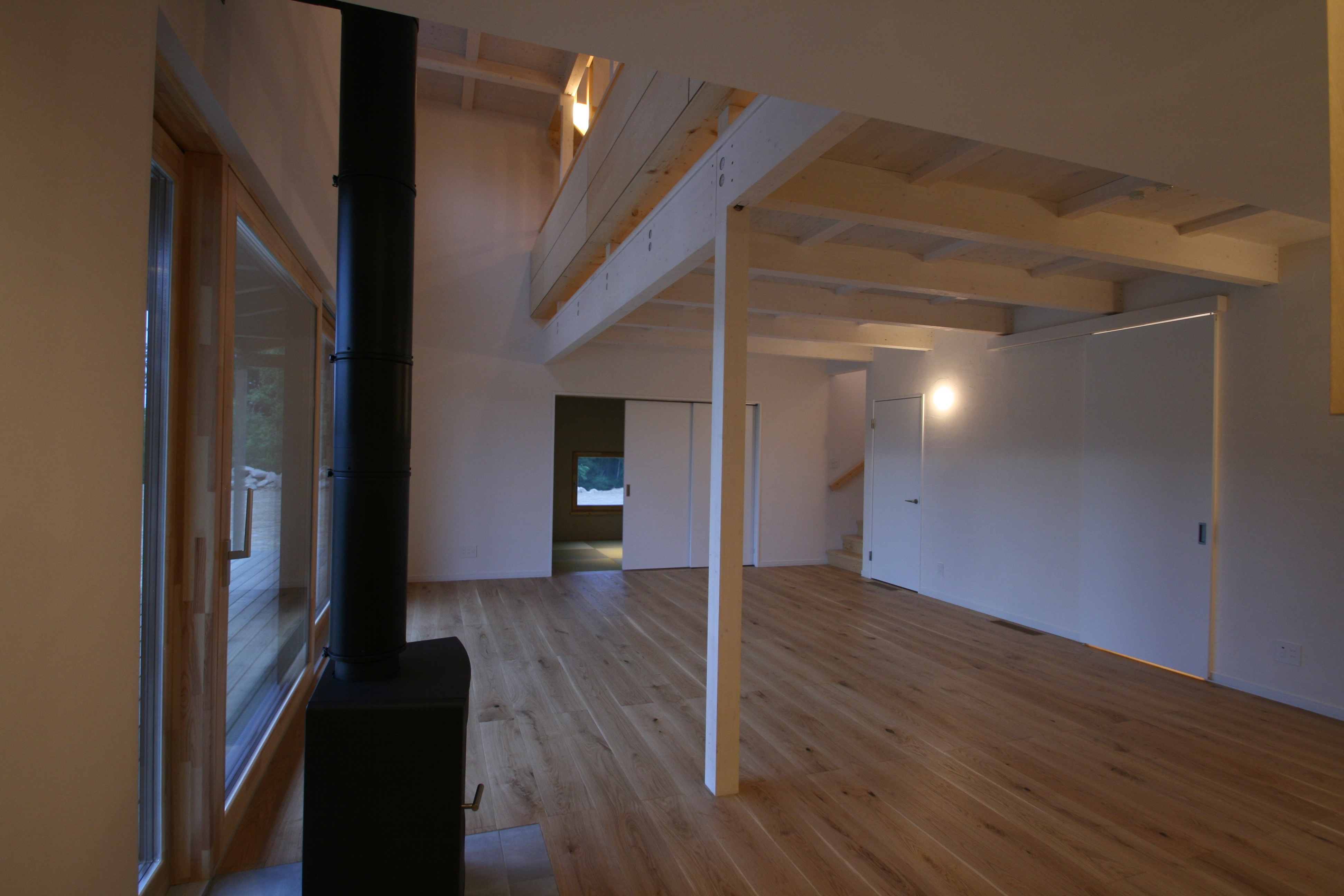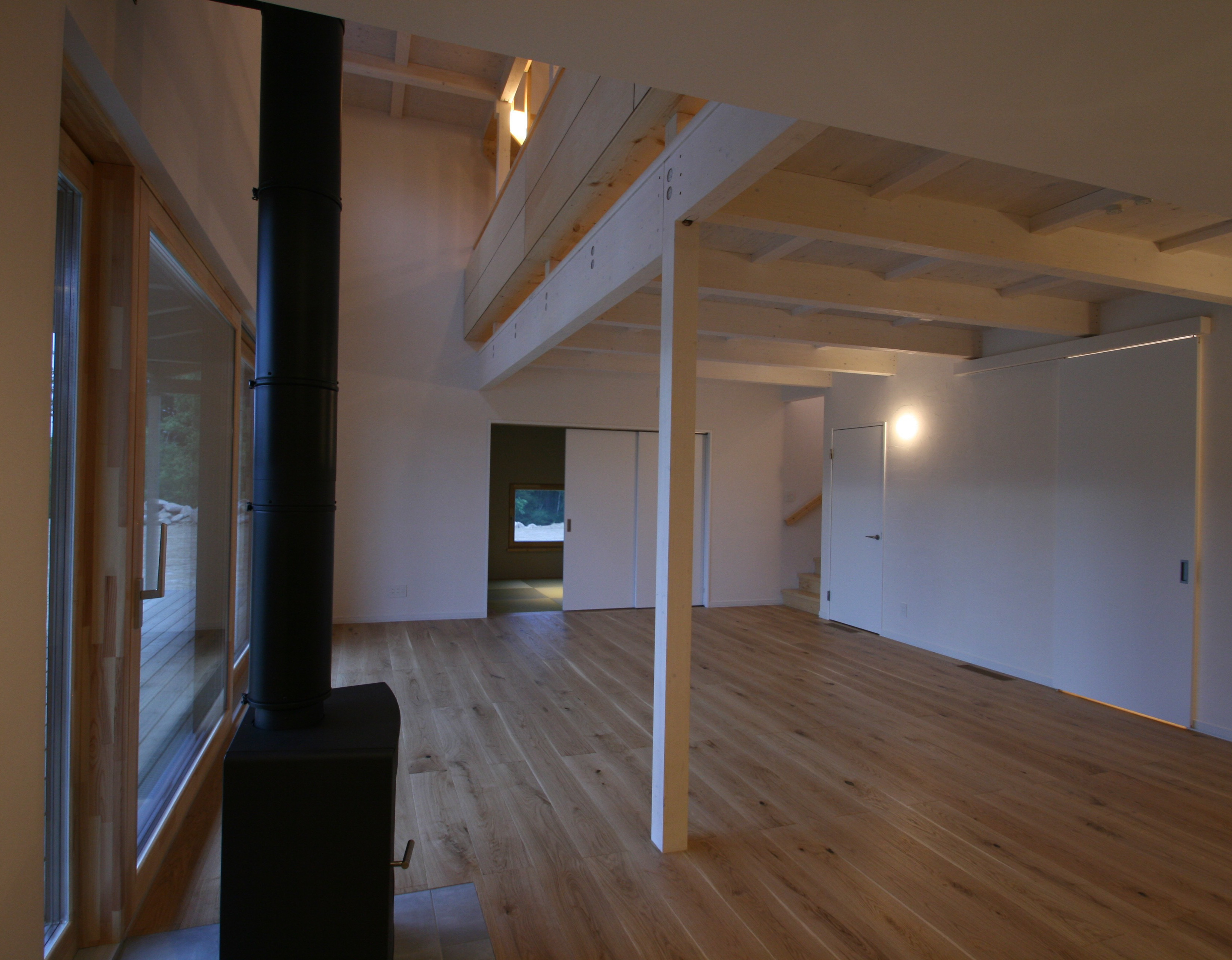 リビングには二間半の木製サッシによる開口部を設け屋根付きウッドデッキ越しに羊蹄山を眺めることができる。ウッドデッキの深い庇で、一階の光が取り入れにくいことから、吹抜けにハイサイドライトを設けて午前の日差しをそこから取り入れることにした。