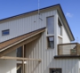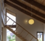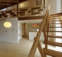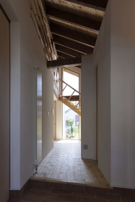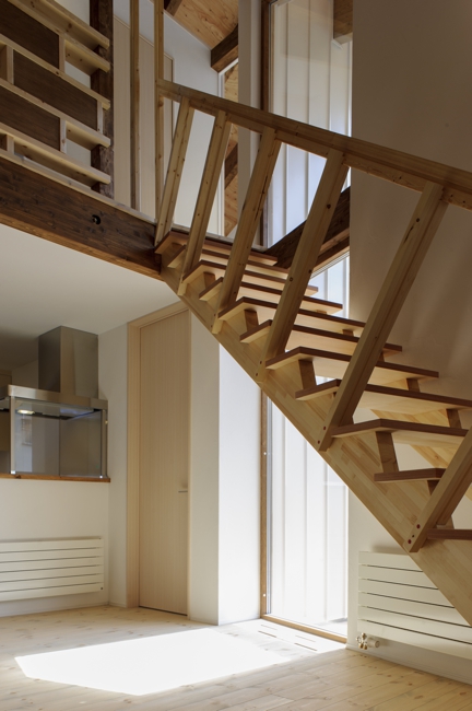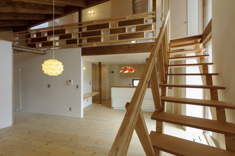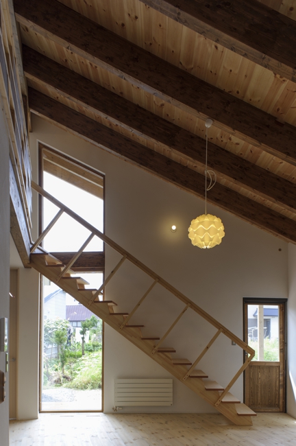 高さの異なるの二つの片流れのボリュームが斜めに交わることで、平面だけでなく高さにも変化が加わり、居間の吹抜けを介して二階との独特なつながりが生まれる。
