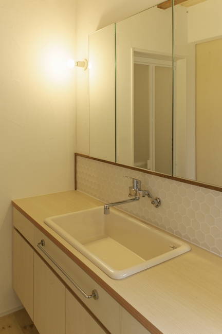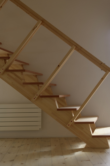 敷地の中で一番気持ちの良い位置に居間を計画し、そこから台所、寝室、二階の個室へつながるプランとした。朝日の差し込む位置に計画した寝室によってテラスが閉鎖的にならないように、居間と外とのつながりを広い角度で開いた。それをきっかけに、居間以外の部屋を斜めに配置して、奥行きを長くした。