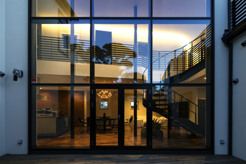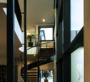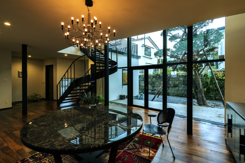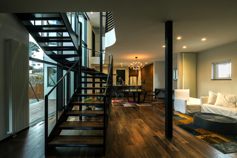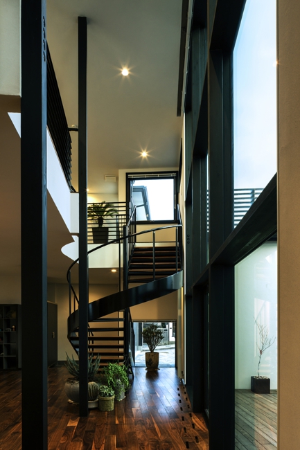 敷地の形状は少し平行四辺形になっていて、母屋は敷地の長手方向に平行に配置するが、前面道路側はガレージを道路と平行配置することで、建物に角度が生まれ、外部の玄関ポーチや内部の吹抜け等にここにしか存在しない敷地形状のエッセンスが入り込む。その吹抜け空間に大きな開口部と中庭を設けてタテ動線に鉄骨の螺旋階段を配置し、それらを中心に諸室へつながる構成となっている。1階LDKの大きな空間に黒く光沢のある鉄骨階段と二階吹抜けの手すりの存在感が、白い塗り壁に際立ってこの建物の名称の由来となる。この黒という色の選択肢が空間に重みも与え、落ち着いた緊張感を加えており、そのイメージをベースに各部のデザインも進め、子供室や主寝室等は空間ごとのテイストを加えている。